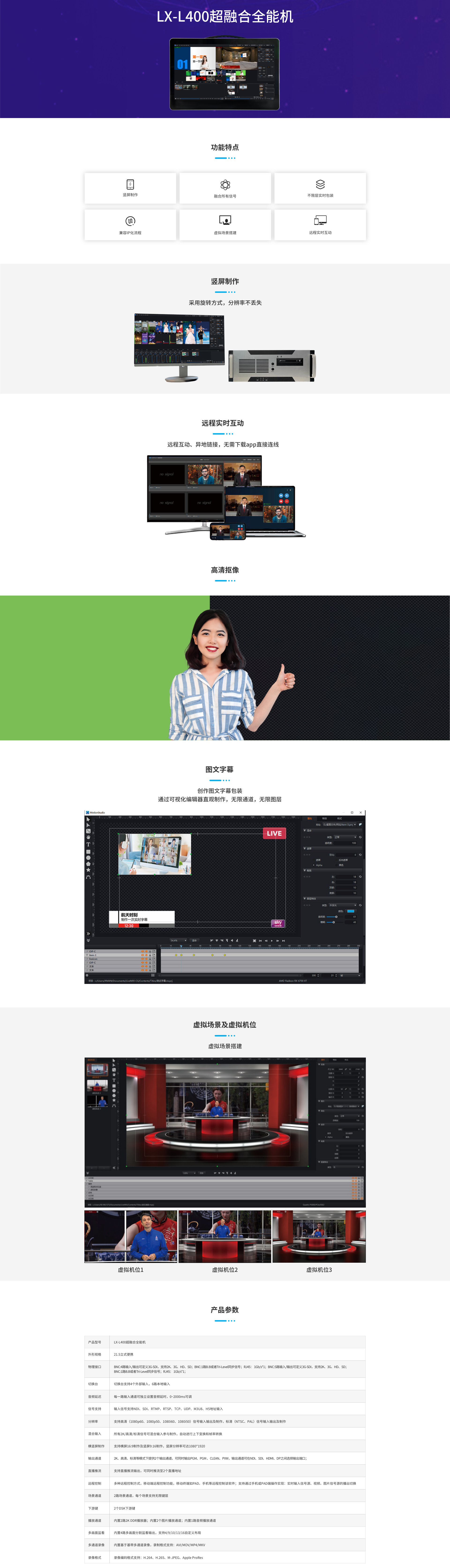 4K 虛擬演播室系統(tǒng)集成5路外部輸入,7路本地輸入,支持4K,具備切換、虛擬字幕、包裝、特效、錄像與多通道錄制、宏命令操控、 PTZ攝像機控制、推流直播功能于一身